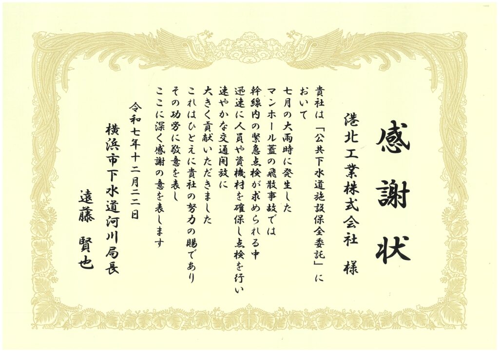 このたび弊社 は、横浜市下水道河川局より感謝状を賜りました。